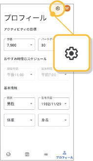 ❶Google Fitアプリを起動しトップ画面右下のメニューから「プロフィール 」をタップ